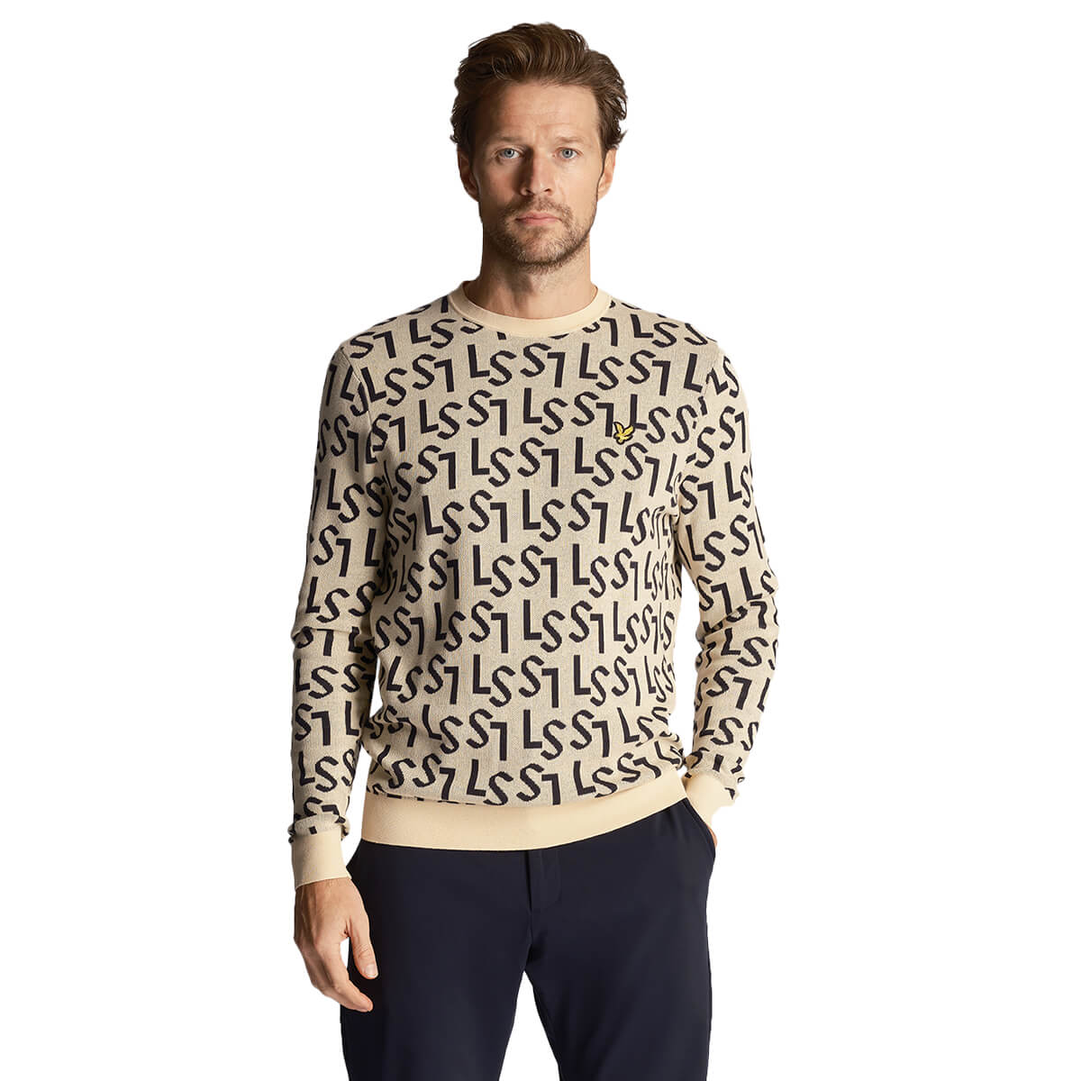 Made in 12-gauge birdseye back jacquard, with a fine lightweight yarn and crew neck. Ribbed cuffs and hem with set-in sleeves. 12-gauge birdseye back jacquard. 100% Cotton. Our team is made up from various different backgrounds in and around the golf scene.