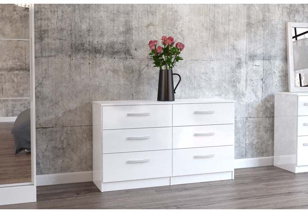 Lynx White Gloss Bedroom Furniture Wardrobe Chest Bedside by Birlea: 3 Drawer Bedside Cabinet: 40cm (W) x 37.9cm (D). The 2 door sliding Wardrobe with Mirror by Birlea combines a high-gloss finish with bold silver detailing.