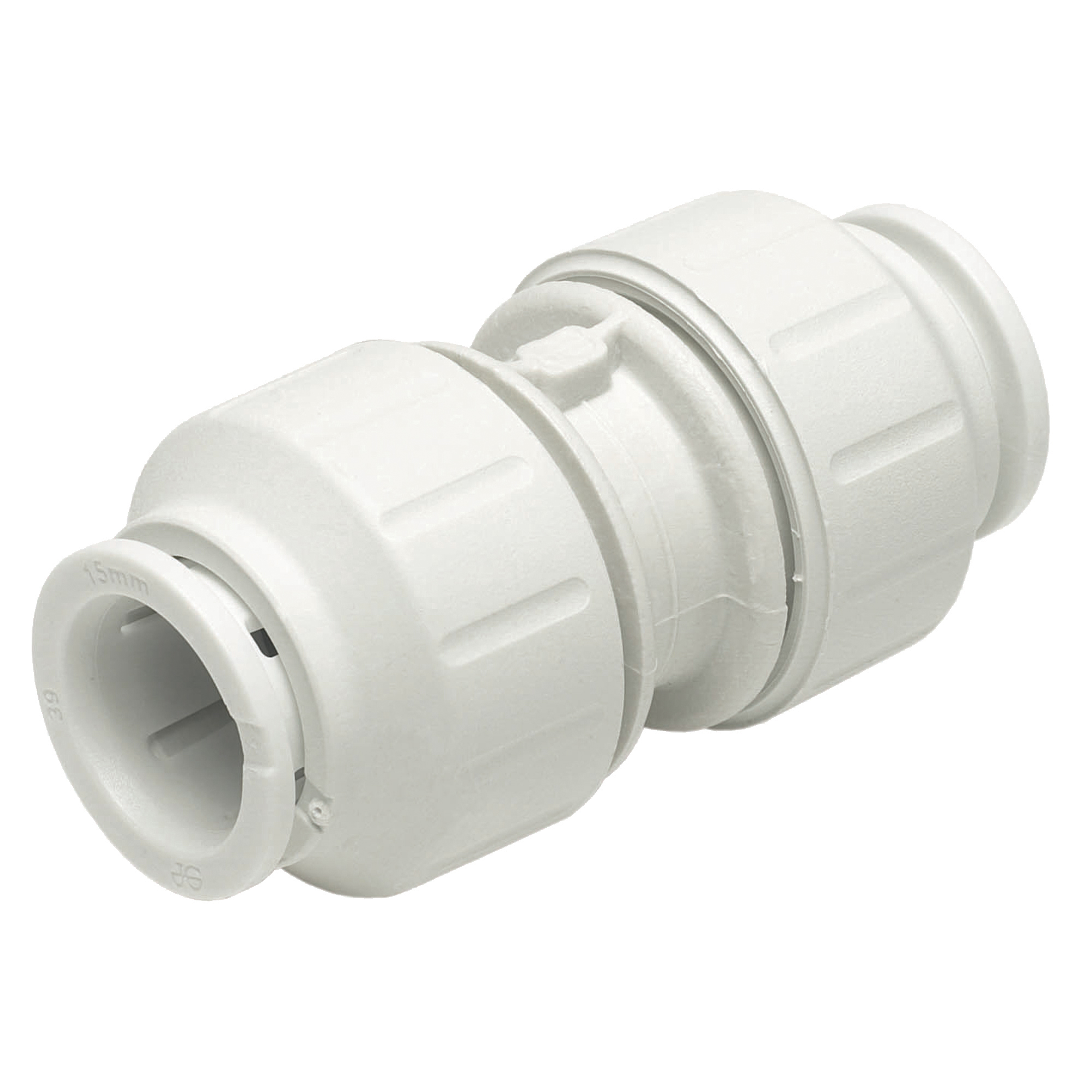 JG Speedfit equal straight connector push-fit fitting for the connection of two equal pipe sizes. Simply push the push-fit fitting fully onto the pipe and twist the plastic nut clockwise to lock in place.