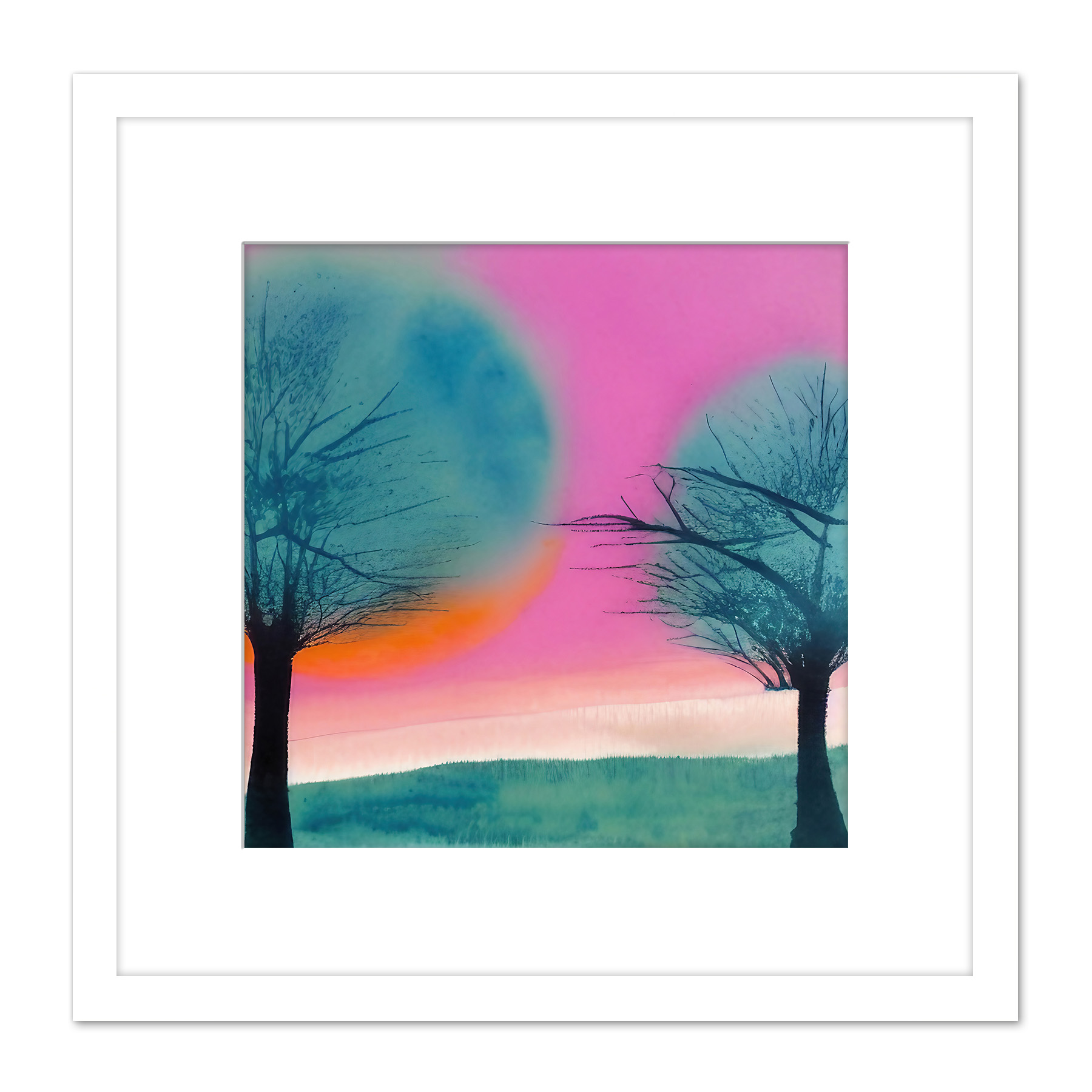 Artery8 Sunset Tree Silhouette Landscape Modern Abstract Pastel Pink Teal Orange Watercolour Painting Square Wooden Framed Wall Art Print Picture 8X8 White