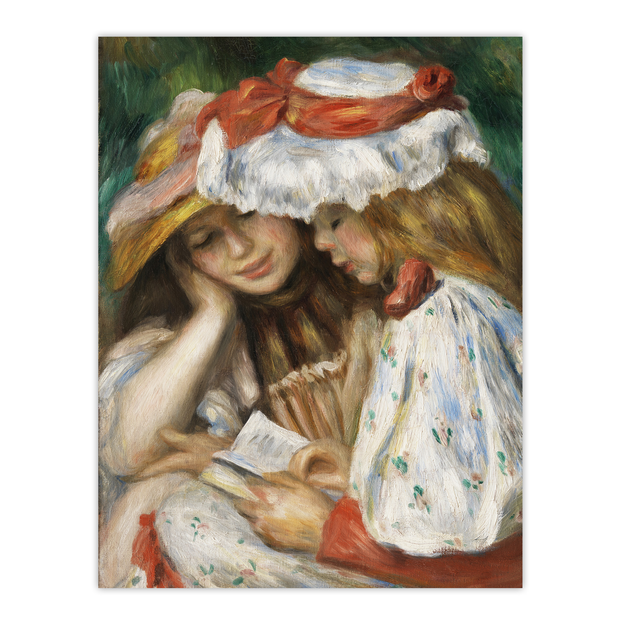 Two Girls Reading – A serene Renoir wall art print portraying two sisters absorbed in a book beneath soft garden light. This print is individually printed onto luxurious smooth satin paper. This is a new and high-quality art print.