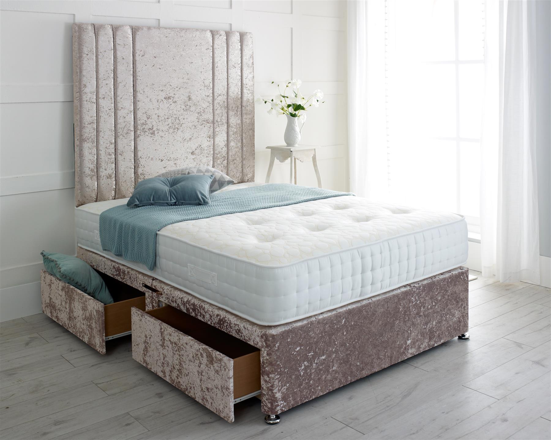 Upholstered in luxuriouscrushed velvet, this bed combines beauty and comfort effortlessly. For added support, choose the optionalpocket sprung mattress to enhance your sleep experience. Type: Divan Bed; Headboard; Pocket Sprung Mattress.