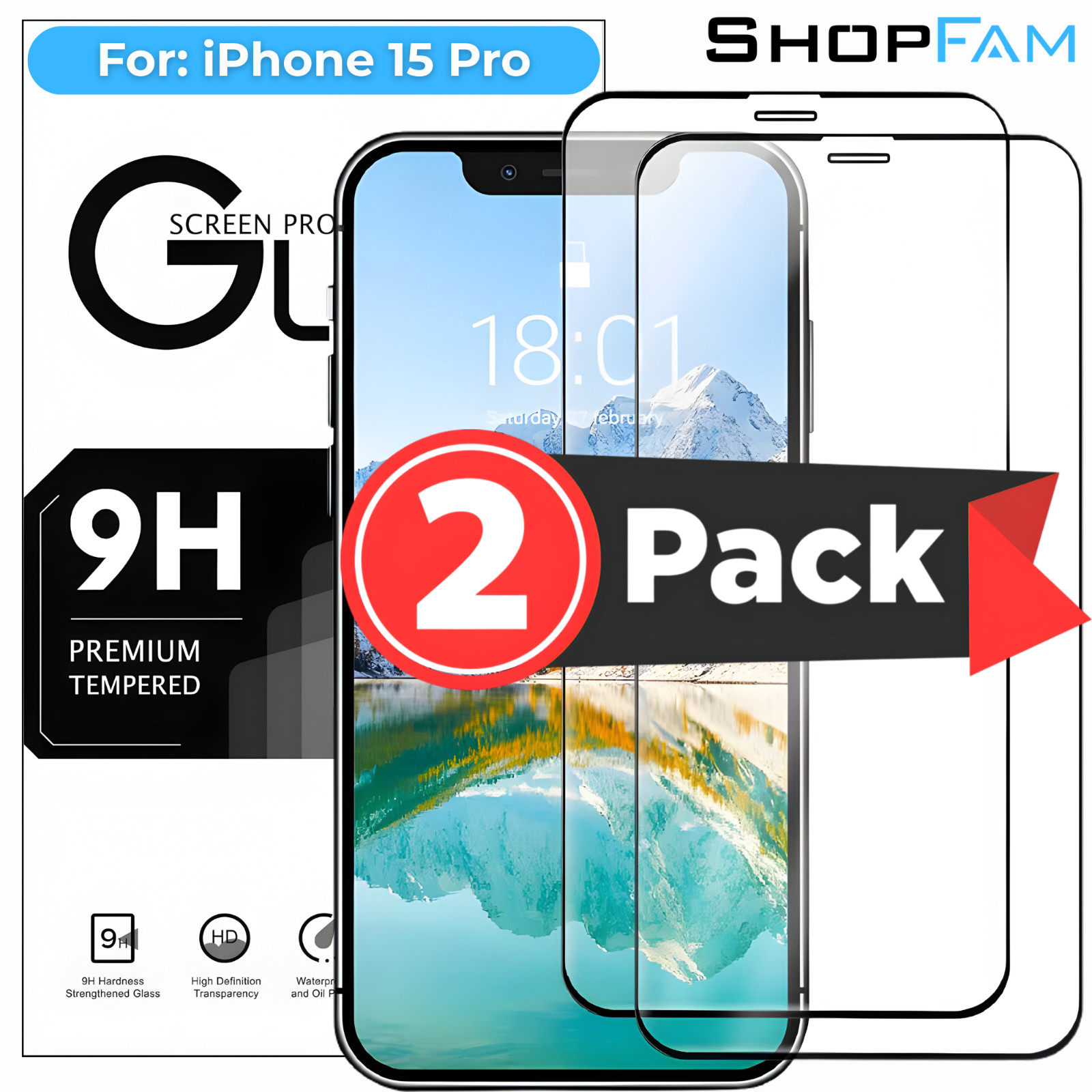 Full cover 9D tempered glass screen protector for iPhone 11–17 Pro/Max. Edge-to-edge protection with 8–9H hardness, oleophobic coating resists fingerprints. Anti-scratch and anti-shatter design; silicon adhesive keeps it secure and case-friendly. Includes 2 black protectors in retail pack.