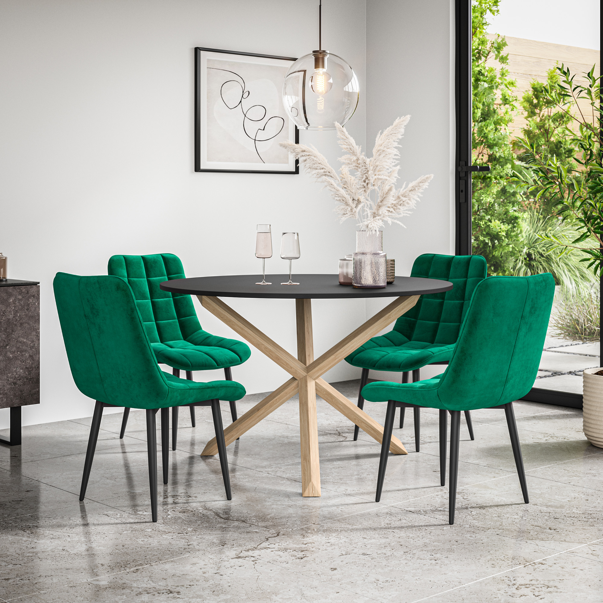 MORE4HOMES Malvern Round Dining Table And Chairs - Clear Glass Table Top w Solid Oak Legs + Anika Velvet Dining Chair Set Of 4 (Green)