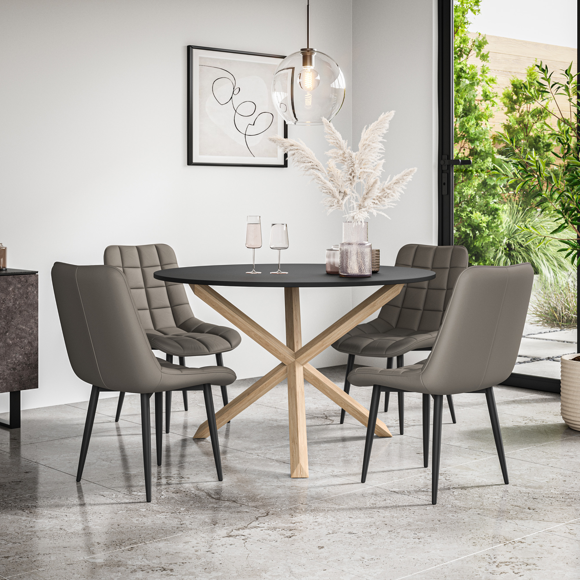 (The Malvern Dining Table can seat 4-6 people, and yet its compact round shape is perfect for maximizing space while creating an inviting and intimate dining experience. Oak, and Black), with 2 types of legs (Solid Oak and Black Solid Oak).