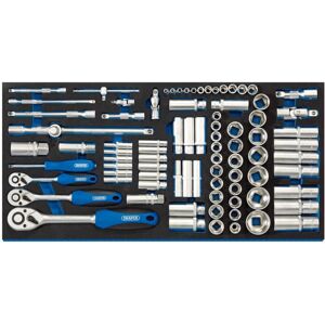Description This 84-piece socket set includes sockets in 1/4", 3/8", and 1/2" drives, all stored in a full drawer EVA insert tray for easy organization. Made from durable chrome vanadium steel, each socket is hardened, tempered, and finished with a satin chrome coating for corrosion resistance. The set features knurled rings on sockets for extra grip and includes a variety of deep and standard sockets, along with ratchets, extension bars, universal joints, and spark plug sockets. Suitable for professional and DIY use, it is compatible with Draper and similar tool chests. Specifications Material: Chrome vanadium steel Finish: Satin chrome plated Drive sizes: 1/4", 3/8", 1/2" Number of sockets: 72 standard and deep sockets Ratchets: 72-tooth reversible with soft grip and quick release Additional tools: Spinner handle, universal joints, extension bars, sliding T-bar, spark plug sockets, and adapters Compatibility and Accessories Compatible with Draper and Draper Expert tool chests and