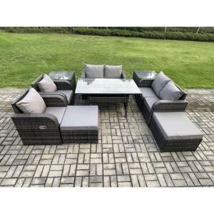 This Modern deluxe rattan garden furniture is best for multiple occasion. The Rattan set is strong durability which lasts for a long time, it also has strong tempered table top glass. Cushions are included and are fitted to the shape of the sofa and chairs for comfort. This wonderful product will help you showcase any garden, patio or conservatory. Set Dimensions: 3 x Sofa with double armrest: 177W x 65D x 66H cm 1 x Side coffee table 65L x 65W x 66H cm 2 x Big footstool 65L x 65W x 34H cm 2 x Fully Assembled Stools :40W x 40D x 34H cm 1 x Rectangular Table: 85L x 50W x 37H cm High-quality Materials: Our rattan garden furniture set is made with light grey mixed rattan and dark grey fabric, ensuring durability and a stylish look. Please note that the color may vary slightly due to lighting or monitor settings. Easy Assembly: The items come flat-packed, requiring self-assembly. Rest assured, our sturdy galvanized steel tube metal frames with powder coating prevent rust, guaranteeing a long-lasting product. Low Maintenance: Our furniture set features removable cushion covers for easy cleaning. We recommend keeping the cushions indoors or using a rain cover when not in use. Additionally, covering the furniture with a rain cover during extended periods of non-use will help maintain its quality. Handmade Craftsmanship: The flat PE rattan used in our furniture set is completely handmade, adding an artisan touch to your outdoor space. The 5mm thickness clear tempered glass with a sucker on the surface prevents sliding, ensuring stability and safety. Ultimate Comfort: With 8cm thick seat cushions and soft pillow back cushions, our rattan garden furniture set offers exceptional comfort for lounging outdoors. Enjoy relaxation at its finest with our high-quality seating option. Factory Directly Sold To Guarantee The Quality And After Sale Service Important notice: pls check the product carefully before signing it .if it arrive with any obvious damage ,pls kindly mark on the receipt .we will file claim to the courier and send the replacement .thank you This item is for kerbeside delivery , we can't deliver to your room . WARRANTY&SUPPORT:Though we have nearly 100% checking before shipment but as this item is 100% by handmade so If you have any issues of assembly, missing parts, damaged or other problems of product quality of this outdoor rattan furniture set, please feel free to contact us, and our after-sales team will respond within 24 hours and offer you the most perfect and powerful solutions Fimous 9 Pieces Rattan Garden Furniture Set Outdoor Garden Sofa Coffee Table Set with Side Table 4 Footstools Light Grey Mixed