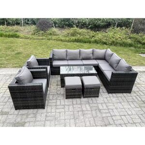 This 10 seater rattan outdoor furniture set is a great addition to patio or garden, made of high quality PE rattan and durable galvanized steel construction for sturdiness and long lasting.Durability,and this garden furniture set can be put Outdoor all year round. Set dimensions: • 2 x Chair Size: 74W * 69 D * 79 H cm • 2 x Small footstools dimension:40L x 40W x 34H cm(Fully Assembled) • 1 x 3 Seater sofa with double armrest: 162L x 67W x 79H cm(Fully Assembled) • 1 x 3 Seater sofa with single armrest: 157L x 67W x 79H cm (Semi-Assembled) • 1 x Rectangular Coffee Table : 85L x 50W x 37H cm • Dark grey mixed rattan with dark grey fabric .Color may vary due to light or monitor .we are unable to return the item due to this problem .Please consult us before purchase if you have requirements on color saturation • Items Comes flat pack ,self assembled is necessary .Sturdy Galvanized Steel Tube Metal Frames With Powder Coating To Prevent The Rust. • Low Maintenance ,Removable Cushion Cover