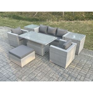 Set Dimensions: • 2 x Three Seater Sofa : 177W x 65D x 66H cm • 1 x Adjustable Table :140L x 80W x 68/48H cm (up 68 cm down 48 cm) • 2 x Chairs: 74L x 65W x 66H cm • 2 x Side Coffee Table: 65L x 65W x 66H cm Light grey mixed rattan with dark grey fabric .Color may some difference due to light or monitor .we are unable to return the item due to color problem . Table Can Be Used Both For Coffee Or Dining Table,Cheap Price Compared With Other On Or Offline Store For Rising Table Set Flat PE Rattan Completely Made By Hand, 5mm Thickness transperant Tempered Glass With Sucker On Surface To Prevent Sliding,8 CM Thick Seat Cushion With Soft Pillow Back Cushion Gives You More Comfort Low Maintenance ,Removable Cushion Cover And Easy Move To Different Place.Pls Keep the Cushion Indoor Or With Rain Cover When Not In Use . Keep The Furniture With Rain Cover If Not Use For Long Time . Items Comes Flat Packed And Easy Assemble,Sturdy Galvanized Steel Tube Metal Frames With Powder Coating To
