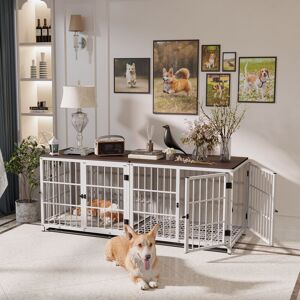 GENERAL DESCRIPTION This furniture-style kennel combines metal wire and a wooden design. It features a wooden tabletop for decorations, dog food, and toys. The heavy metal wire construction is durable, rust-resistant, and provides ample ventilation for your pet's comfort. The crate has three doors with strong latches to prevent escapes and allows easy access for puppies. It includes a removable tray for easy cleaning and can accommodate a dog bed for a comfortable sleeping space. The crate offers more space than typical options and can be combined with additional crates to create a larger unit or even a TV cabinet. TECHNICAL SPECIFICATIONS Type: Dog Crate Door: 3 doors Features: End Table/Crate, with removable tray Material: 40% Metal Iron, 50% MDF, 10% PE Color: White and Dark Walnut Wood Size: Medium Net Weight: 19.1 kg (42.1 lbs) Product Dimensions: 78.5 x 56.8 x 65 cm (30.9 x 22.2 x 25.6 inches) Package Size: 91 x 75.5 x 16.5 cm (35.8 x 29.7 x 6.5 inches) Shipping Weight: 21.58 kg