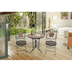 Add a quirky touch to your outdoor dining area with this garden bistro set for 2 from Outsunny. It includes a round side table covered in a beautiful and unique mosaic tile design with two matching and foldable chairs to complete. Each piece of this folding garden furniture is built on a solid reinforced metal frame to ensure strength and stability. Our metal garden furniture set is the perfect set for relaxing with a friend in your garden, patio, conservatory or balcony. Features: Three-piece bistro set that includes a small table and two matching chairs Folding chairs to move easily and store away Elegant and unique mosaic design Made with strong and durable reinforced metal framing Easy to clean and low maintenance No assembly required Specification: Item Name: 3pcs Bistro Set Brand Name: Outsunny Material: Metal, Mosaic Colour: Black, Orange and White Table Dimension:?60x72.5Hcm Chair Dimension: 50Lx40.5Wx90Hcm Seat Size: 36Wx38Dcm Backrest Height: 46cm Folded Dimension: 99Lx43Wx10Hcm (chair) Weight Capacity: 70kg (table), 160kg (chair) Flat Pack: YES Custom Label: 84B-260