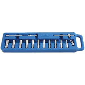 A set of 1/4""D universal joint sockets with single Hex profile, in sizes from 5mm to 15mm, designed to provide greater access to hard to reach fixings. Manufactured from chrome vanadium steel with a chrome plated finish. Supplied in an EVA foam tray - designed to fit roll cab drawers, keeping the sockets clean, tidy and ready for use. Sizes: 5, 5.5, 6, 7, 8, 9, 10, 11, 12, 13, 14, 15mm. 1/4""D x single Hex (6pt) profile. Universal joint head provides excellent access to confined areas. Manufactured from chrome vanadium with a chrome plated finish. Supplied in a toolbox friendly EVA foam tray (25 x 150 x 164mm).