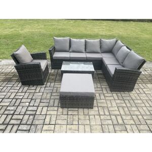 This classic high back sofa set can accomodate 9 peoples and has a comfortable and soft back, made of new premium dark grey mixed PE rattan Set Dimensions: • 3 Seater sofa with two arm : 170L x 69D x 79H cm • 3 Seater sofa with single arm: 160L x 69D x 79H cm • 1 pc rising dining table: 140L x 80W x 68/48H cm (height up 68,down 48) • 1x Footstool :65L x 65W x 34H cm • 1 pc Chair: 74W x 69D x 79H cm Dark grey mixed rattan with dark grey fabric .Color may Vary due to light or monitor .we are unable to return the item due to this problem .Please Consult Before Purchase if you have requirement on color saturation. Table Can Be Used Both For Coffee Or Dining Table,Great Price Compared With Other Online Or Offline Store For Rising Table Set Items Comes Flat Packed And Easy to Assemble,Sturdy Galvanized Steel Tube Metal Frames With Powder Coating To Prevent Rust, Ergonomic High Back And Declining Design For More Comfort Flat PE Rattan Completely Made By Hand, 5mm Thick Transperant Tempered
