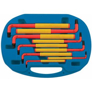 A comprehensive set of long handled fully insulated hex and star keys, IEC60900 certified for live working up to 1000V AC/ 1500V DC, ideal for use by electricians, auto electricians or mechanics working on hybrid and electric vehicles. The sizes are clearly marked on the side for easy identification and are supplied in a robust carry case for safe storage. Hex keys include: 2.5, 3, 4, 5, 6, 8, 10 & 12mm. Star* (for TORX� fixings) include: T10, T15, T20, T25, T27, T30, T40, T45, T50, T55 & T60. Manufactured to IEC60900 standards, for safe operator use on live voltages up to 1000V AC / 1500V DC. VDE certified. Manufactured from S2 Steel, with Polypropylene (PP) & Thermoplastic Rubber (TPR) handles. Supplied in a robust blow mould carry case for safe storage. TORX� is a registered trademark of Acument Intellectual Properties, LLC.