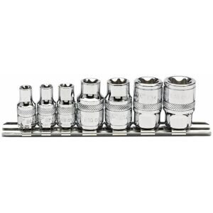 Expert Quality, 7 Ribe® socket bits, 100mm long. All socket manufactured from hardened and tempered chrome vanadium steel with sand blasted bits of S2 silicon steel. Each socket has a knurled ring for extra grip. Supplied on a steel socket retaining rail. Contents 4 x Ribe® 3/8" socket bits: M6, M7, M8, M10 3 x Ribe® 1/2" socket bits: M12, M13, M14