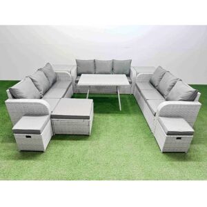Luxury PE Rattan Sofa Set - Premium Outdoor Furniture for Patio & Garden Transform your outdoor space into a stylish oasis with this deluxe PE rattan sofa set expertly crafted for durability, comfort, and timeless elegance. Perfect for hosting guests or unwinding under the sun! Premium Quality Construction All-Weather PE Rattan: UV-resistant, non-fading woven wicker withstands sun, rain, and temperature changes. Rust-Proof Galvanized Steel Frame: Powder-coated for enhanced corrosion resistance and long-term stability. Industrial-Grade Weight Capacity: Sofas support up to 250kg, tables hold 80kg built for reliability. Ergonomic Comfort Features Ultra-Plush Cushions: 8cm thick seat cushions + soft backrests with removable, machine-washable covers (dark grey premium fabric). 5mm Tempered Glass Tabletop: Anti-slip suction pads ensure safety; scratch-resistant surface. Set dimensions: 2 x Love Sofa Size: 124W x 67D x 79H cm 2 x Fully Assembled Stools :40W x 40D x 34H cm 1 x Oversized Footstool: 65L x 65W x 34H cm 1 x Side Table: 65L x 65W x 66H cm 1 x Dining Table: 110L x 70W x 70H cm Hassle-Free Assembly & Maintenance Flat-Pack Delivery: Easy-to-follow instructions with numbered parts. Low Maintenance: Wipe rattan with damp cloth; store cushions indoors or use included rain covers during off-seasons. Modular Design: Rearrange components effortlessly to suit your space. Important Notes Color: Light grey rattan + dark grey fabric (minor monitor color variations possible contact us for fabric samples). Delivery: Curbside drop-off only; inspect packages before signing. Report damages immediately for free replacements. Weather Protection: Use provided rain covers for long-term outdoor storage.