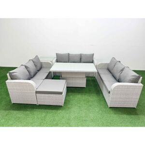 Set Dimensions: 2 x Sofa with double armrest: 177W x 65D x 66H cm 1 x PC dining table with fire pit: 140L x 80W x 69H cm 2 x Small fully assembled footstools 40L x 40W x 34H cm 2 x Side coffee table 65L x 65W x 66H cm 2 x Arm chairs size: 74L x 65W x 66H CM Dark grey mixed rattan with dark grey fabric .Color may vary littble bit due to light or monitor .we are unable to return the item due to this problem .please consult before purchase if you have requirement on color saturation.the product is delivered on pallet,to kerbside only