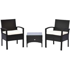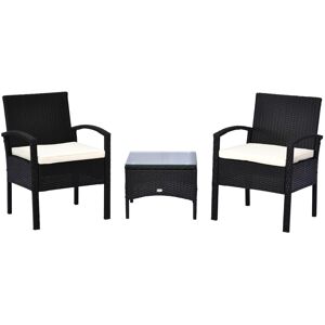 GENERAL DESCRIPTION The Outsunny rattan bistro set for 2 features a contemporary design, providing a comfortable outdoor lounging experience. It is perfect for the poolside, deck, or patio, allowing you to relax and enjoy your outdoor time. TECHNICAL SPECIFICATIONS Colour: Black, Cream White Material: Steel, PE Rattan, polyester fabric Chair Size: 59W x 59L x 84H cm Tea Table Size: 50L x 50W x 38H cm Seat Size: 50W x 47D cm Seat Height: 44 cm Chair Weight Capacity: 160 kg Tea Table Weight Capacity: 50 kg Item label: 863-039BK COMPATIBILITY AND ACCESSORIES The set includes 2 chairs and 1 coffee table. OTHER INFORMATION Sturdy yet lightweight construction with steel tube Quality PE rattan, weather-proof and UV resistant Table features 5mm transparent tempered glass Deep armchairs with soft padded cushions for comfort Removable zipped cushion cover made of 180g/㎡ polyester, machine washable