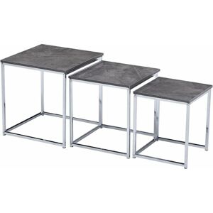 Nested tables set of 3 These 3 nesting tables are all square and could be nested in one. Easy to clean The tabletop is high-gloss and can be easily cleaned. Chromeplated frame The table legs are 13x13 mm square tubes with a carefully chromeplate surface. Foot pad Each table foot gets a foot pad. Ensure the metal wont scratch your floor. Nested Tables Set of 3 --- Technical Information Size of Table A 40x40x42 cm / 15.7x15.7x16.5 inch Size of Table B 35x35x38.5 cm / 13.8x13.8x15.2 inch Size of Table C 30x30x35 cm / 11.8x11.8x13.8 inch Totally Weight 6.5 kg Surface High gloss Shape Square Thickness of the table top 12 mm Materital of the table top Medium Density Fiberboard (MDF) Cross-section of the table leg 13x13 mm Available Colour Black Marble/White Marble/Grey Beton/Pure Black/Pure White Assembly Note: While assembling, please do not tighten the screws totally at first in order to avoid damage to other parts/boards/plates. All the all part are in position, then fully tighten all