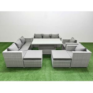 This deluxe rattan rising sofa dining set is a great addition to patio or garden, made of high quality PE rattan and durable galvanized steel construction for sturdiness and long lasting.Durability ,and can be put outdoor all year round. Set Dimensions: • 2 x Three Seater Sofa : 177W x 65D x 66H cm • 1 x PC Rising dining table: 140L x 80W x 68/48H cm (height up 68, down 48) • 2 x Small fully assembled footstools :40L x 40W x 34H cm • 2 x Side Coffee Table: 65L x 65W x 66H cm Light grey mixed rattan with dark grey fabric .Color may some difference due to light or monitor .we are unable to return the item due to color problem. Table Can Be Used Both For Coffee Or Dining Table,Cheap Price Compared With Other On Or Offline Store For Rising Table Set Items Comes Flat Packed And Easy Assemble,Sturdy Galvanized Steel Tube Metal Frames With Powder Coating To Prevent The Rust Flat PE Rattan Completely Made By Handmade, 5mm Thickness Clear Tempered Glass With Sucker On Surface To Prevent